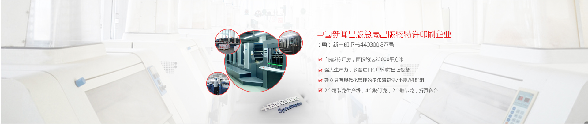 公司實力雄厚,設(shè)備先進。 聚集了許多高等院校的尖端高級印刷專業(yè)人才,擁有國際頂尖的、全球最大的成套印刷設(shè)備— - 德國海德堡-對開四色、五色、雙色、單色、四開四色機等的主體印刷設(shè)備, 擁有高水準后道加工系統(tǒng)—— 全電腦控制的斯塔爾折頁機、 STAHL 自動折頁機、 全自動鎖線機、 全自動騎馬訂聯(lián)動機、馬天尼膠裝龍、 程控切紙機、環(huán)保型過膠機、啤機等 精良裝備,整套印前印后設(shè)備。